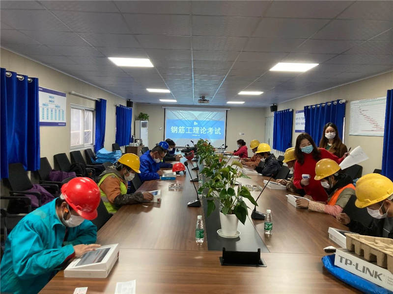理論考試在百酈華庭項(xiàng)目部會議室進(jìn)行,由無錫市鑒定中心提供的移動式平板電腦上完成考試。