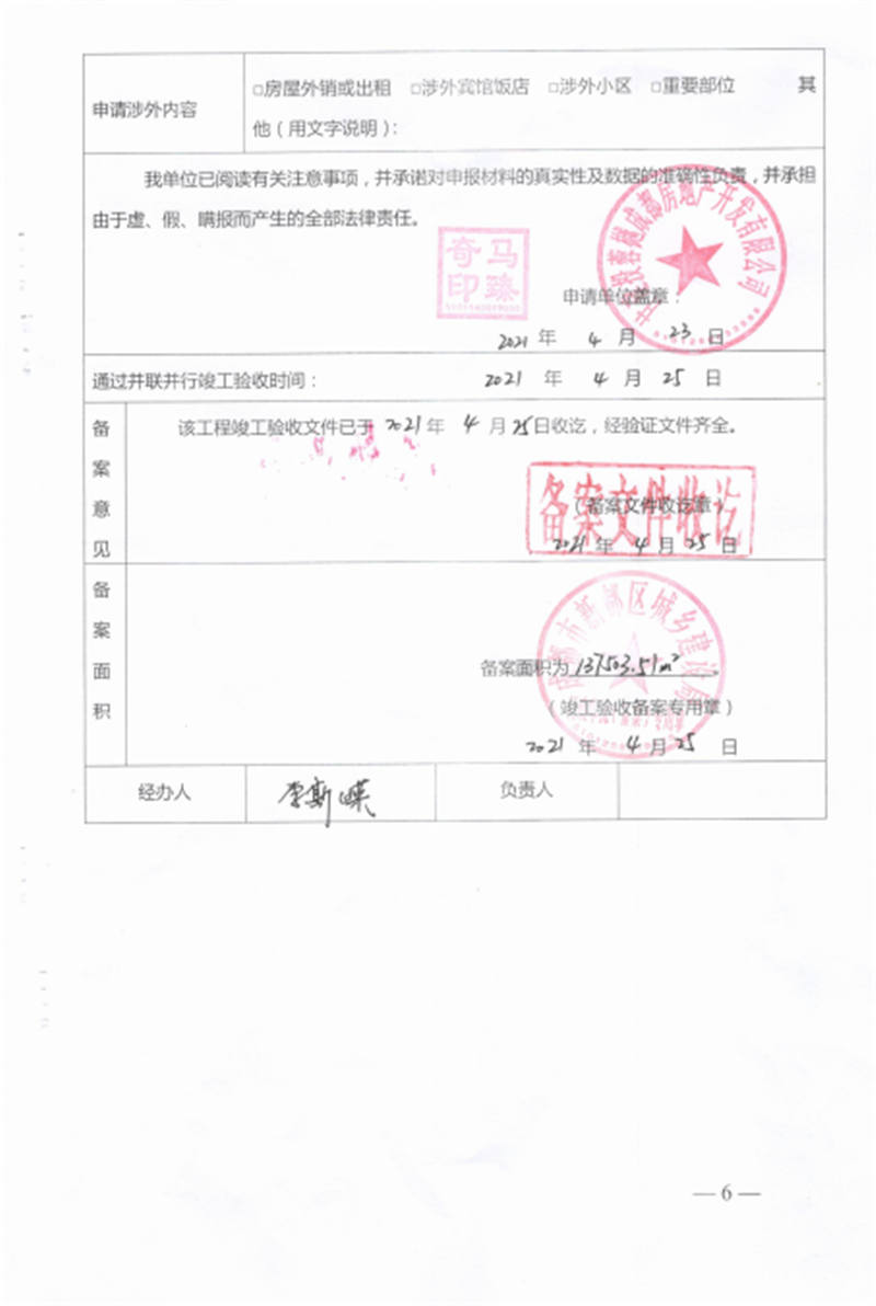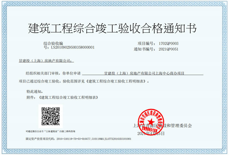 4月25日,成都百酈錦城、上海甘建投商務廣場項目程工取得《建筑工程綜合竣工驗收合格通知書》標志著項目已正式完成竣工驗收,全面進入交付階段。
