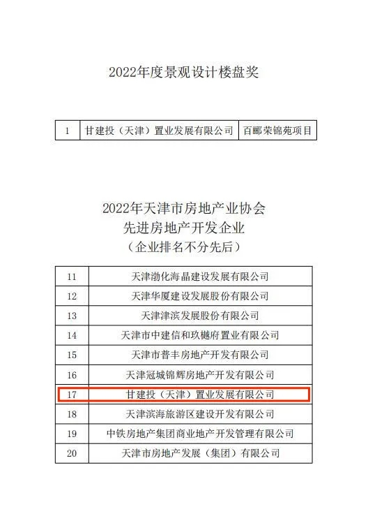 近日,由甘肅建總置業(yè)發(fā)展有限公司天津置業(yè)子公司開發(fā)建設(shè)的百酈榮錦苑項(xiàng)目榮獲天津市房地產(chǎn)業(yè)協(xié)會(huì)2022年度景觀設(shè)計(jì)樓盤獎(jiǎng)及先進(jìn)房地產(chǎn)開發(fā)企業(yè)。