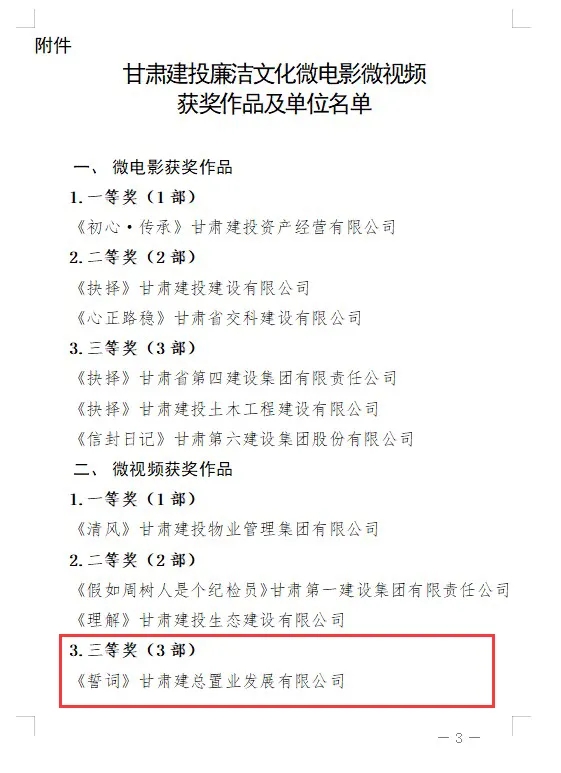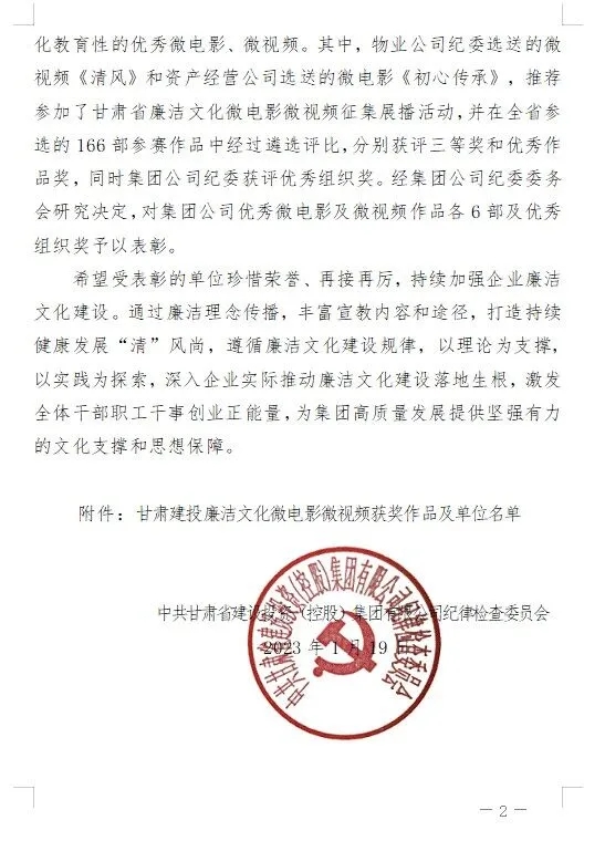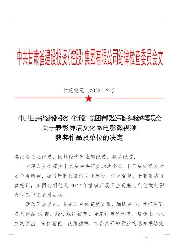 1月19日,在集團(tuán)公司紀(jì)委2022年開展的全司廉潔文化微電影微視頻評選展播活動中,公司紀(jì)委榮獲“甘肅建投廉潔文化微電影微視頻三等獎”榮譽稱號。