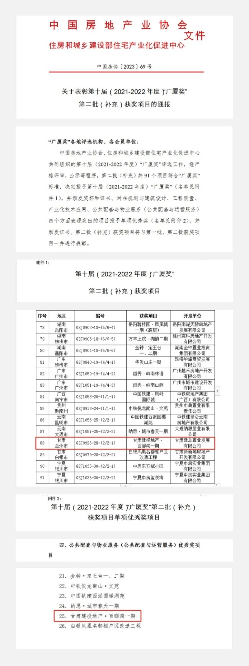 5月15日,由甘肅建總置業(yè)發(fā)展有限公司開發(fā)建設(shè)的百酈灣一期項目榮獲中國房地產(chǎn)業(yè)最高榮譽獎項“廣廈獎”,其中公共配套與物業(yè)服務獲得第十屆廣廈獎單項優(yōu)秀獎,成為甘肅省獲此殊榮的兩個項目之一。