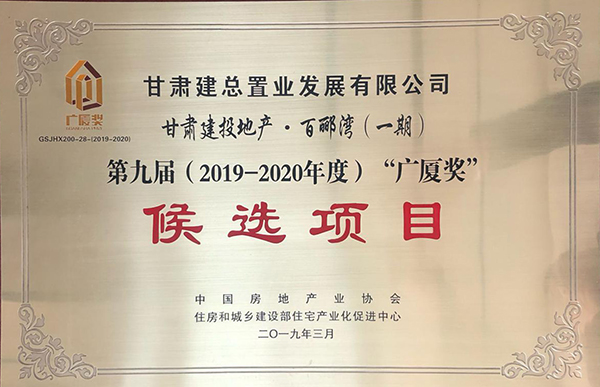 4月11日,在中國(guó)房地產(chǎn)協(xié)會(huì)各地房協(xié)會(huì)長(zhǎng)、秘書(shū)長(zhǎng)工作會(huì)議上,“甘肅建投地產(chǎn)?百酈灣(一期)”項(xiàng)目入選第九屆(2019—2020年度)“廣廈獎(jiǎng)”候選項(xiàng)目。