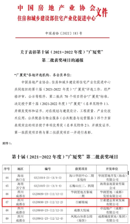 近日,由甘肅建總置業(yè)發(fā)展有限公司成都公司開發(fā)建設(shè)的百酈錦城項目榮獲中國房地產(chǎn)業(yè)最高榮譽“廣廈獎”。