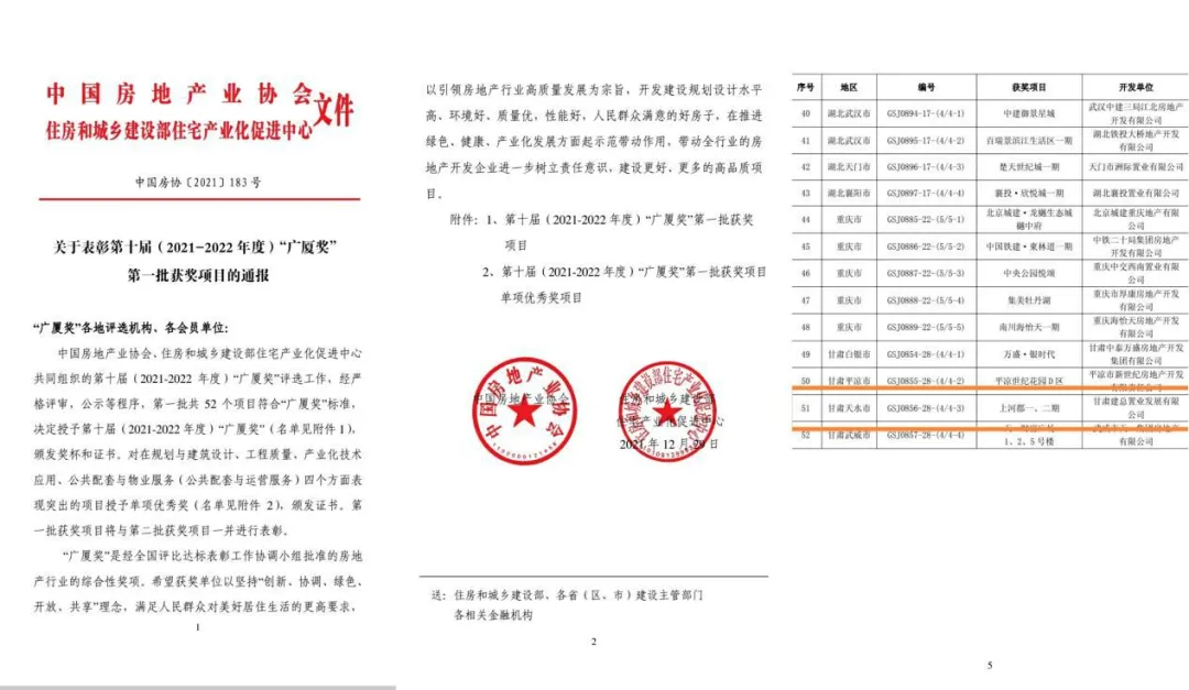 近日,由甘肅建投置業(yè)公司開發(fā)建設的天水上河郡一、二期住宅項目,榮獲第十屆(2021-2022年度)第一批中國房地產“廣廈獎”。該項目成為置業(yè)公司在天水開發(fā)建設的項目中第二個獲得該殊榮的項目。也是2022最驚喜的新年禮物。