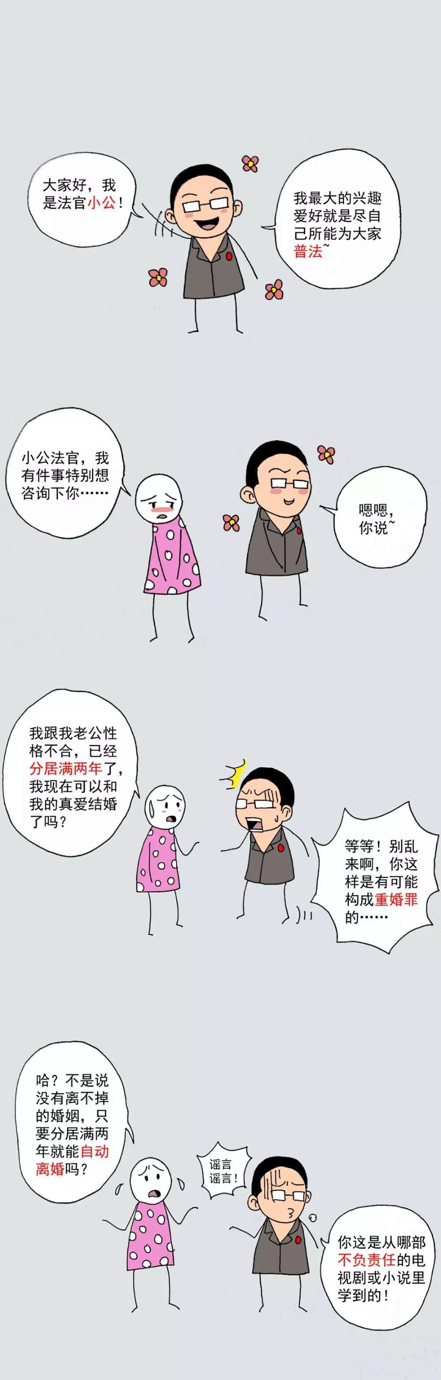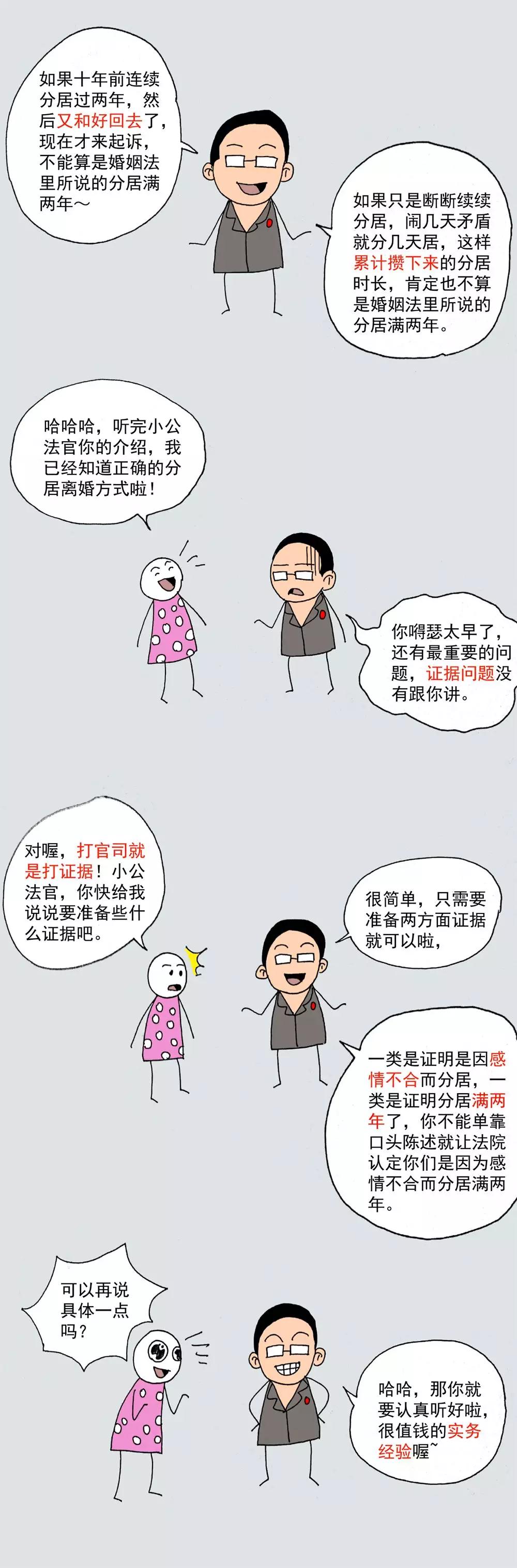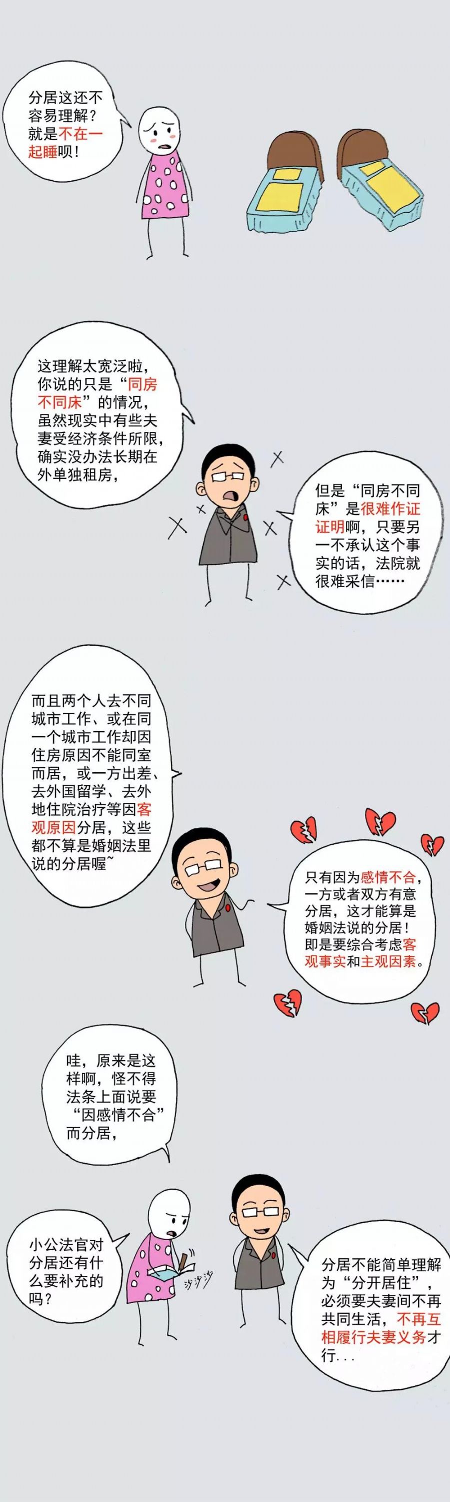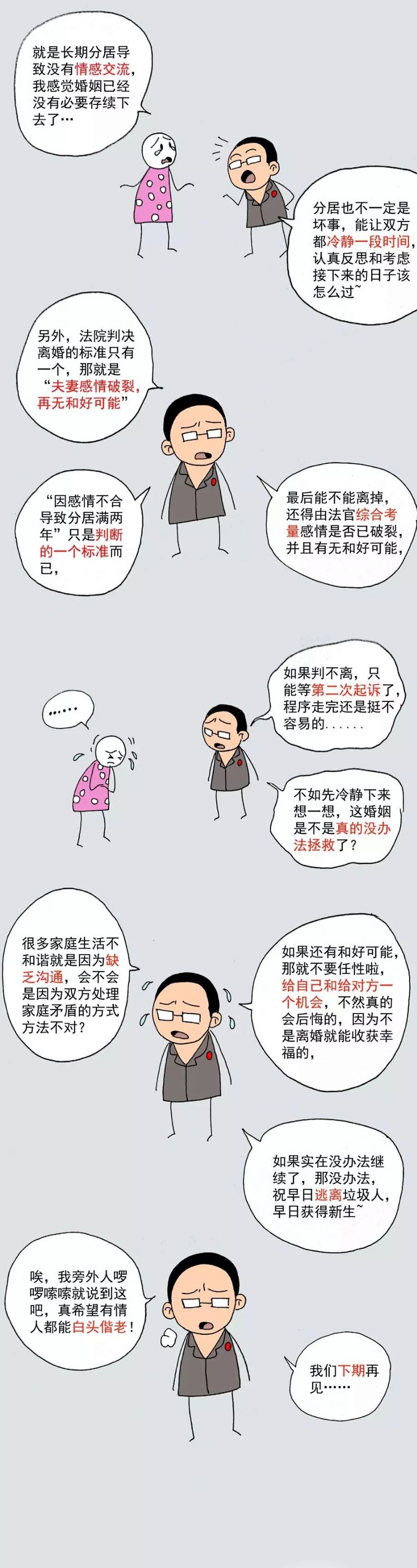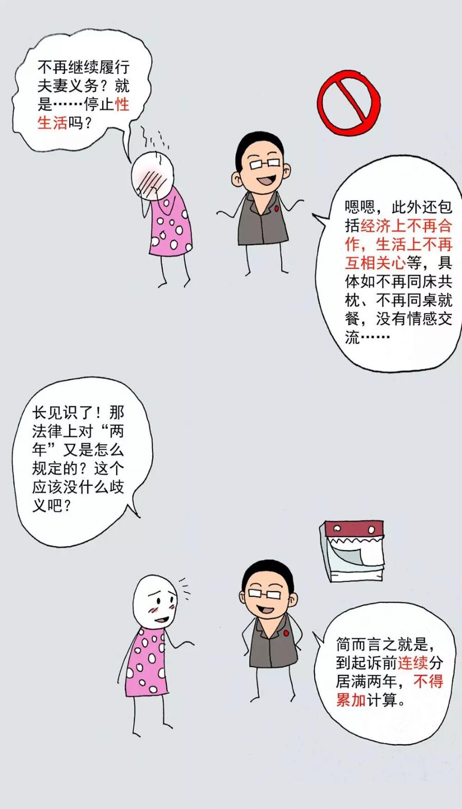 7.因感情不和分居已滿(mǎn)3年,確無(wú)和好可能的,或者經(jīng)人民法院判決不準(zhǔn)離婚后又分居滿(mǎn)1年,互不履行夫妻義務(wù)的。